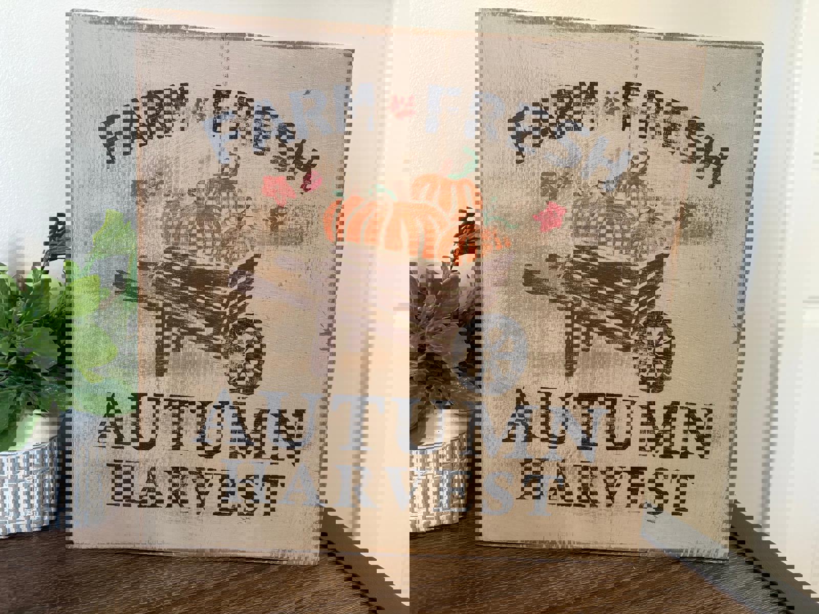 Decorate your home with this charming Farm Fresh Autumn Harvest wooden plaque sign.