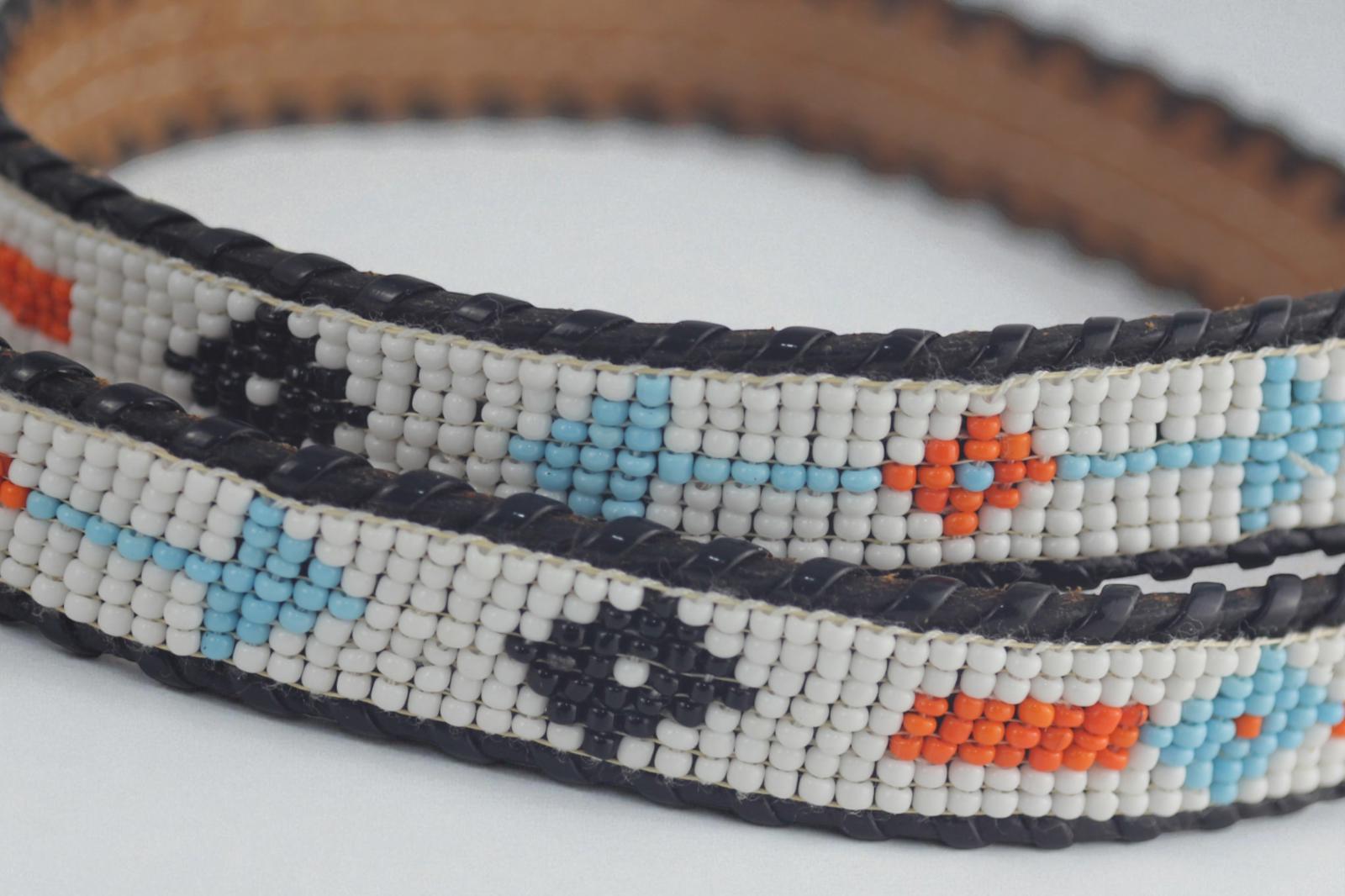This elegant women's belt features authentic looking Native American beadwork, showcasing intricate patterns in vibrant hues of blue, orange, black, and white.