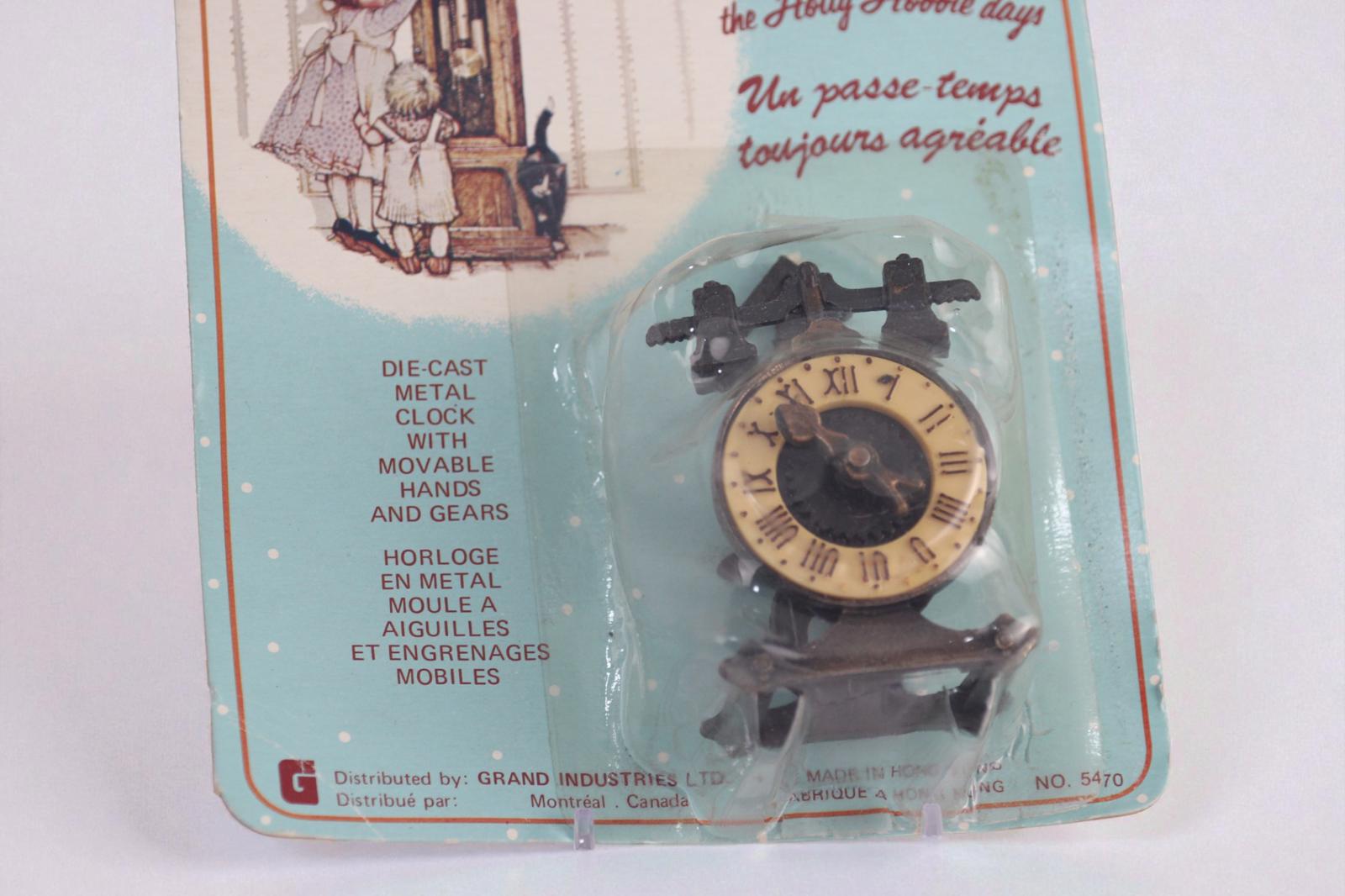 This set includes four vintage-style die-cast metal miniature clocks and other furniture from the Holly Hobbie collection, perfect for dollhouse enthusiasts and collectors.