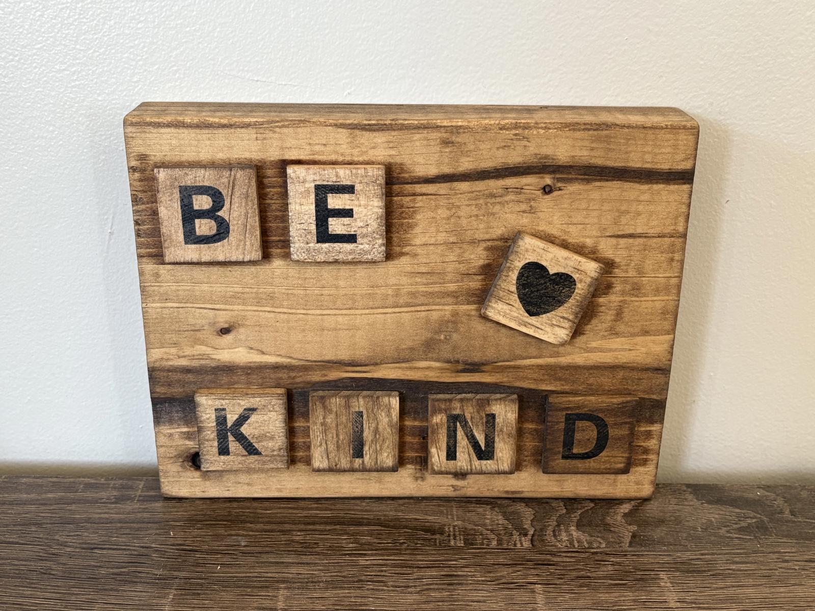 Charming rustic wooden plaque featuring the inspirational message 'Be Kind' with a heart accent.