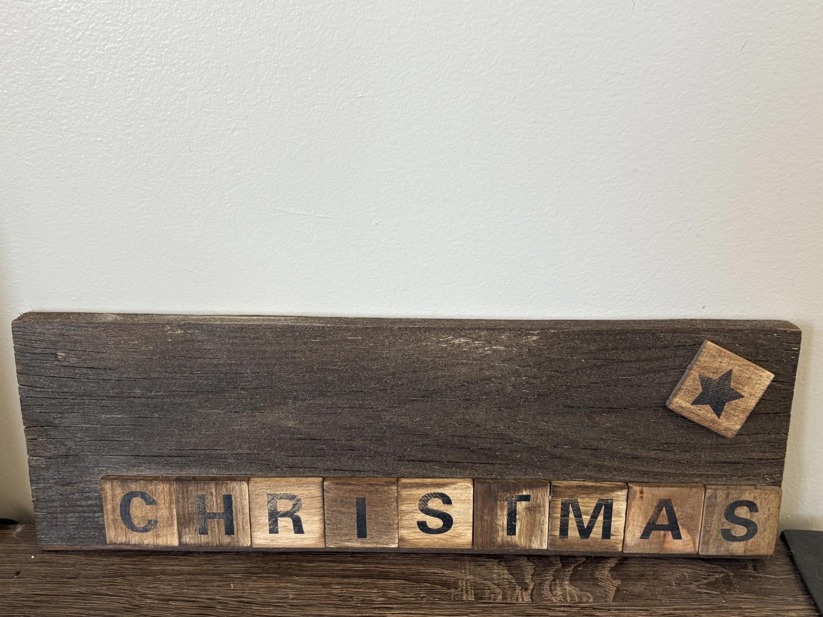 Enhance your holiday decor with this charming rustic wooden sign featuring the word 'CHRISTMAS' spelled out with individual wooden blocks.