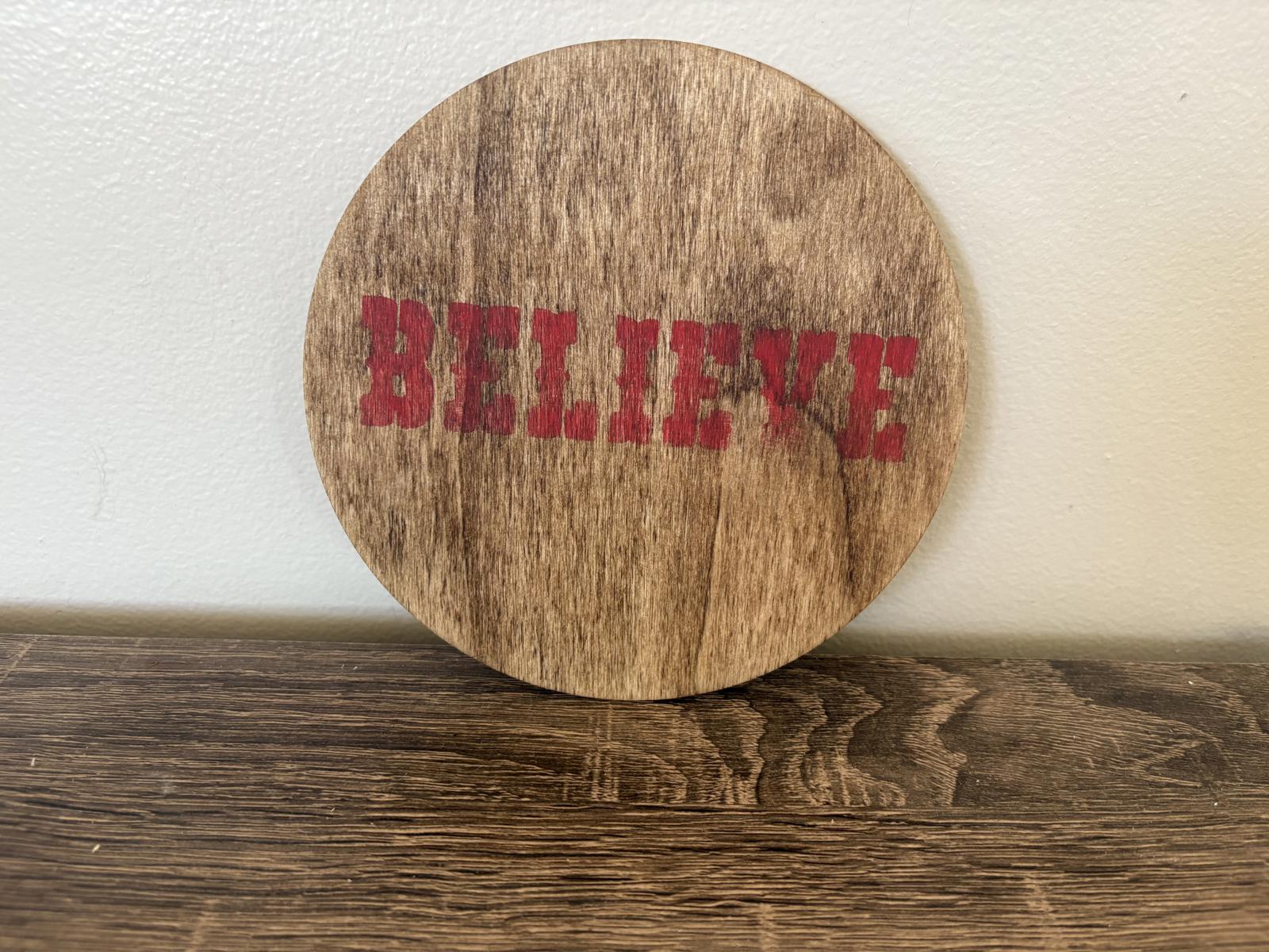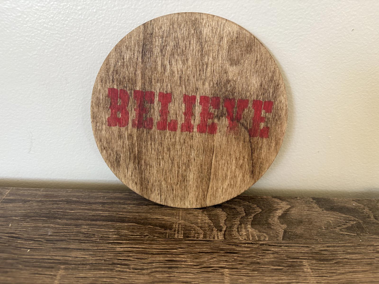 This beautifully crafted wooden plaque from Savvy Creations features the word "BELIEVE" in bold red letters, perfect for adding a rustic and inspirational touch to your seasonal decor.