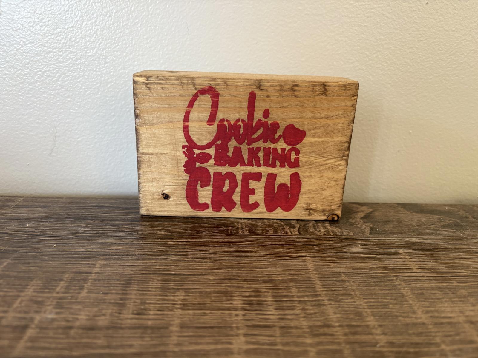 New with tags Savvy Creations wooden antique plaque featuring the phrase "Cookie Baking Crew" in bold red lettering.