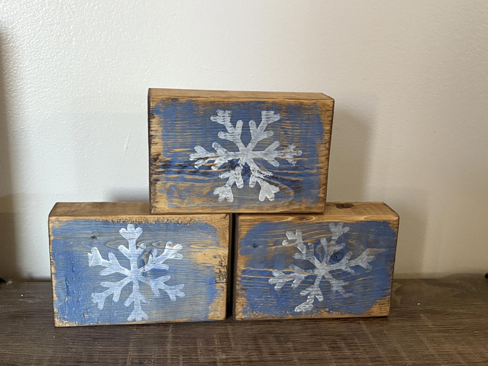 Enhance your winter and holiday decor with this charming set of wooden blocks featuring hand-painted silver snowflakes on a rustic blue background.