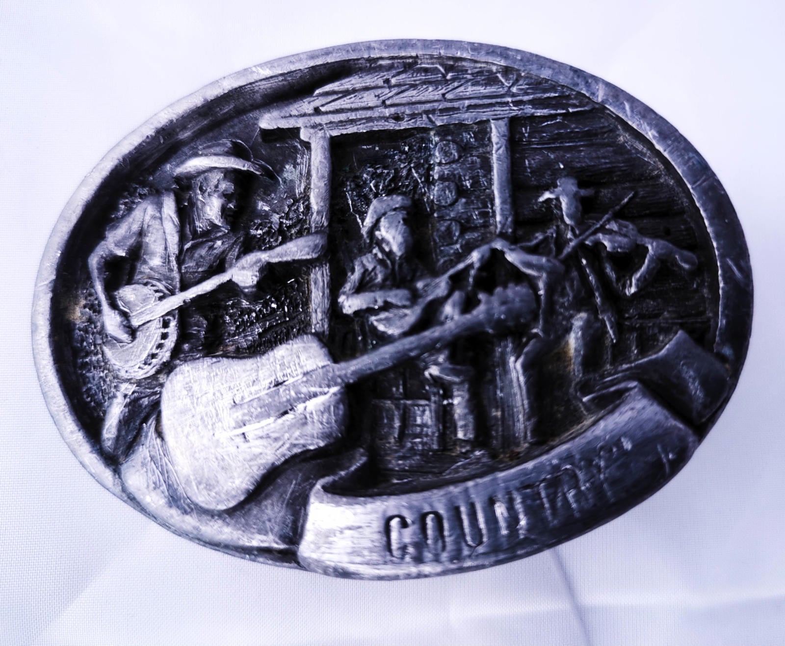 This vintage belt buckle by CJ Inc., dated 1981, features a detailed country music scene with musicians playing instruments.