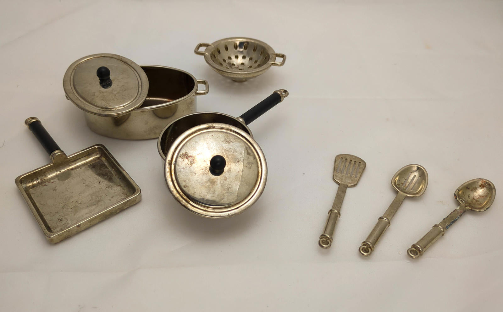 Each pot’s about 10 cm end to end — real lids, tiny handles, and that undeniable “mid-century toy that could probably still cook an egg if you dared” energy. Comes with pots, a frying pan, a strainer, and a handful of miniature utensils — all gloriously imperfect.
